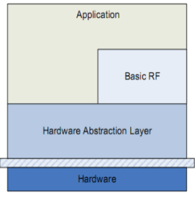 这里我使用的是TI公司的Basic RF通信作为节点之间通信的基础,它拥有IEEE 802.15.4的标准的数据包的接收和发送功能,Basic RF包括Hardware layer、Hardware Abstraction layer、Basic RF layer以及Application layer四层,Hardware layer负责实现数据传输的基础,Hardware Abstraction layer提供结构来访问控制GPIO、UART、ADC等,Basic RF为无线传输提供协议,Application layer封装好提供给用户使用Basic RF和HAL层的函数。其组成框架图如图所示