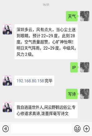 除了web版本,还在便利的原则上对微信公众号进行了接入,利用tornado后台对微信公众号进行二次开发,实现了公众号接入wukong语音平台回复功能,在tornado程序中加入一个层级目录,再利用wechatpy的SDK,完成get方法对token的验证过程以及post方法的回复功能,具体效果如图所示: