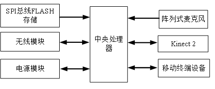 控制数据采集终端硬件结构框图如图 3.1 所示,它主要包括中央处理器(香橙派Aipro)、阵列式麦克风、Kinect 2、移动终端设备、无线通信等模块。除此之外还有电源模块和指示灯。