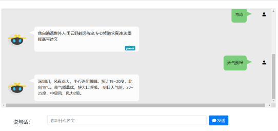 主界面主要负责和wukong进行交互,用户通过编辑框编辑命令,在按下发送按钮后,触发index.js中的函数进行处理,最后将处理结果以{"type": "text", "query": query, 'validate': getCookie('validation'), "uuid": uuid}的json格式作为网页参数,服务端的post读取对应参数交付回复函数进行应答,html再读取通过logger.debug('response msg: {}'.format(msg))读取日志记录文件将插件回复的内容以{'code': 0, 'message': 'ok', 'resp': msg, 'audio': audio, 'plugin': plugin}的json格式作为网页读取参数,读取msg字段进行显示,具体UI如图所示: