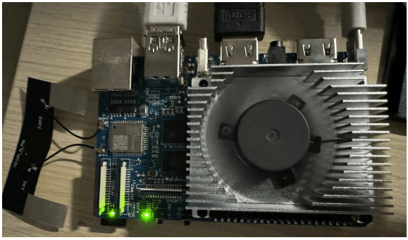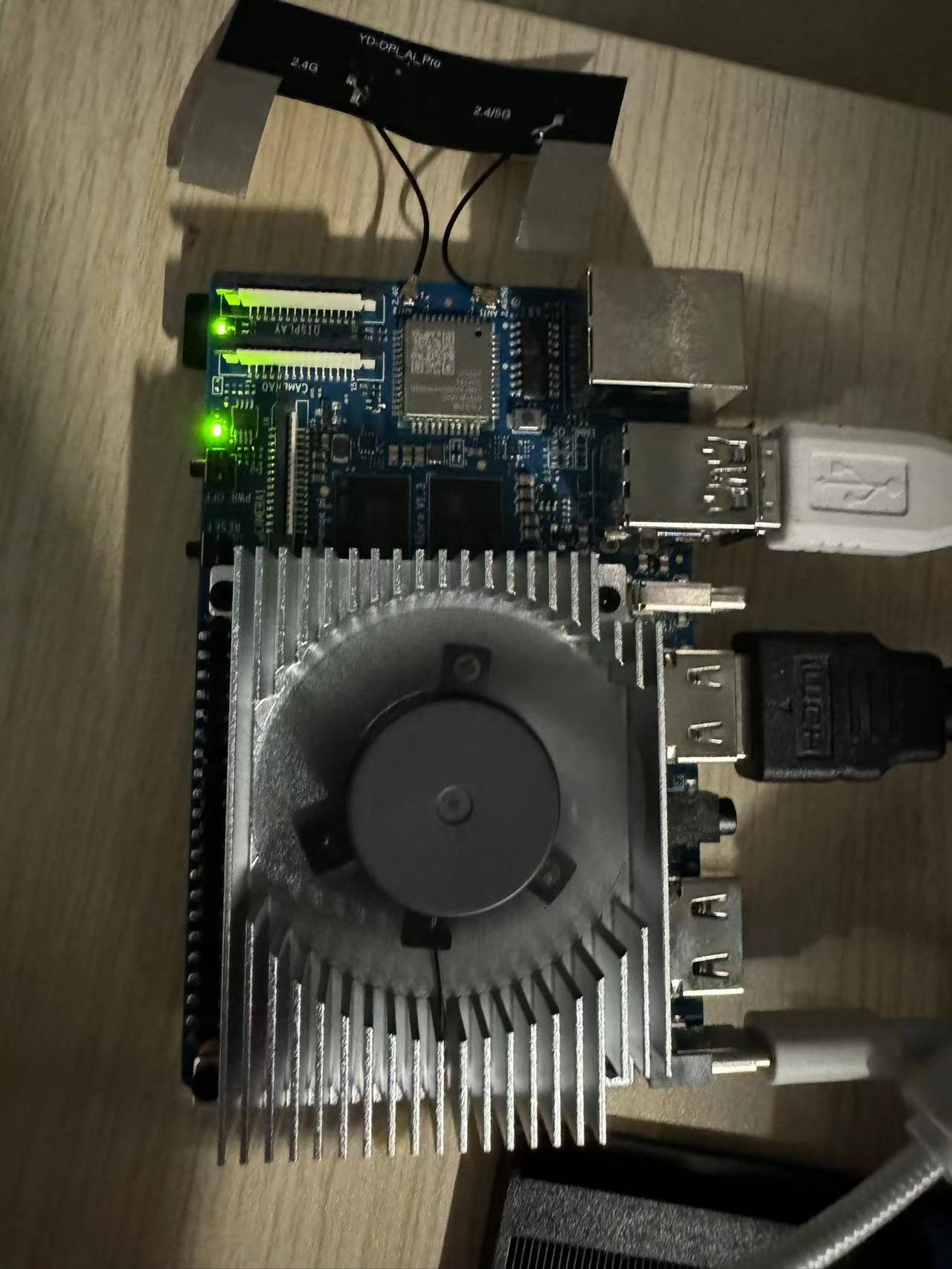 官方贴心的放上了散热风扇,可以做到自调节,上面也有两个USB接口,一个网口,两个HDMI,一个耳机口,两个Type,接口上中规中矩,下面是40个pin扩展口,有特殊需求可以自己扩展。左边是一个WiFi模块,伸长这么多,笔者觉得有点不太方便。