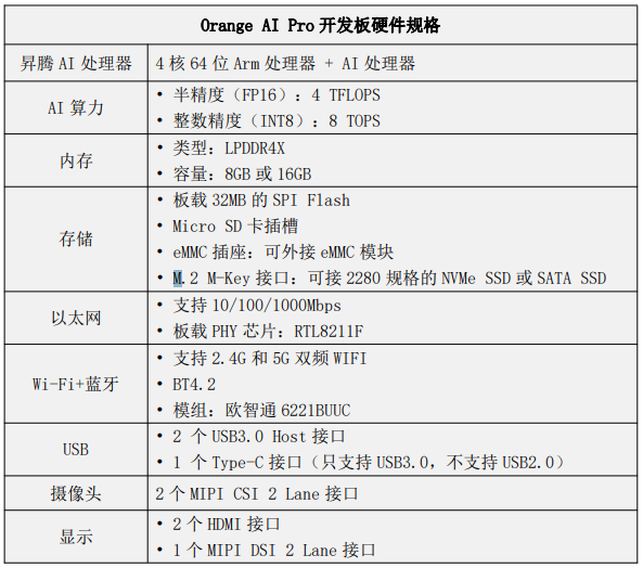 香橙派AIPro 开发板是香橙派联合华为精心打造的高性能 AI 开发板,可谓是国产在芯片领域的一大创新之作,在性能开发板上提供了另一选择。在硬件方面上,其搭载了华为自研的昇腾 AI 处理器,官方称可提供 8TOPS INT8 的计算能力。所以本文就准备跑一些AI样例,来测试一下这个开发板的实际性能到底能达到多少。 根据官方表示,内存类型为LPDDR4X,用在开发板上是妥妥的够。存储上板载了32MB 的 SPI Flash,还有SD接口,惊喜的是,还有M.2接口,以前买过的开发板都没出现过,这对想组NAS的玩家,提供了新的方案还省了一笔费用,并且集成度更高,组起来更省空间。同时,香橙派AIPro支持蓝牙跟WiFi,频段也升级到了5GHZ。具体信息如下表:
