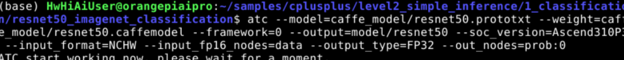atc --model=caffe_model/resnet50.prototxt --weight=caffe_model/resnet50.caffemodel --framework=0 --output=model/resnet50 --soc_version=Ascend310P3 --input_format=NCHW --input_fp16_nodes=data --output_type=FP32 --out_nodes=prob:0