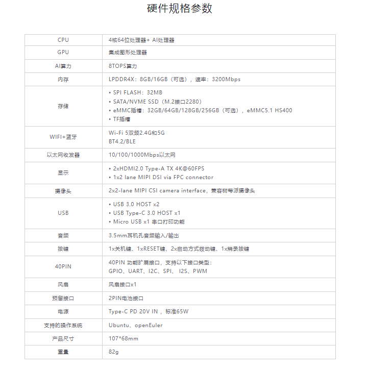 - 具备8TOPS的AI算力,能够高效处理目标识别、图像分类等AI任务。