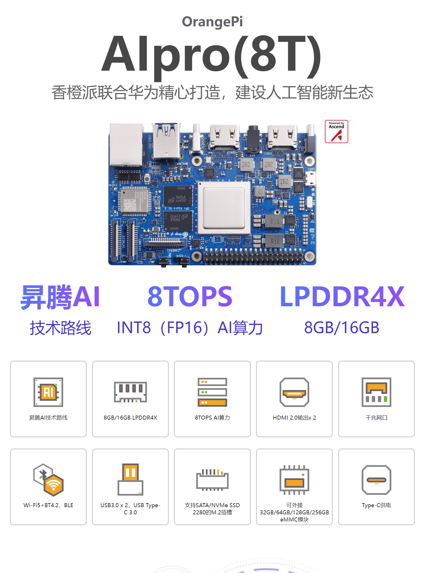 - 香橙派Orange Pi AIpro适用于AI教学实训、AI算法验证、智能小车、机械臂、边缘计算、无人机等领域。