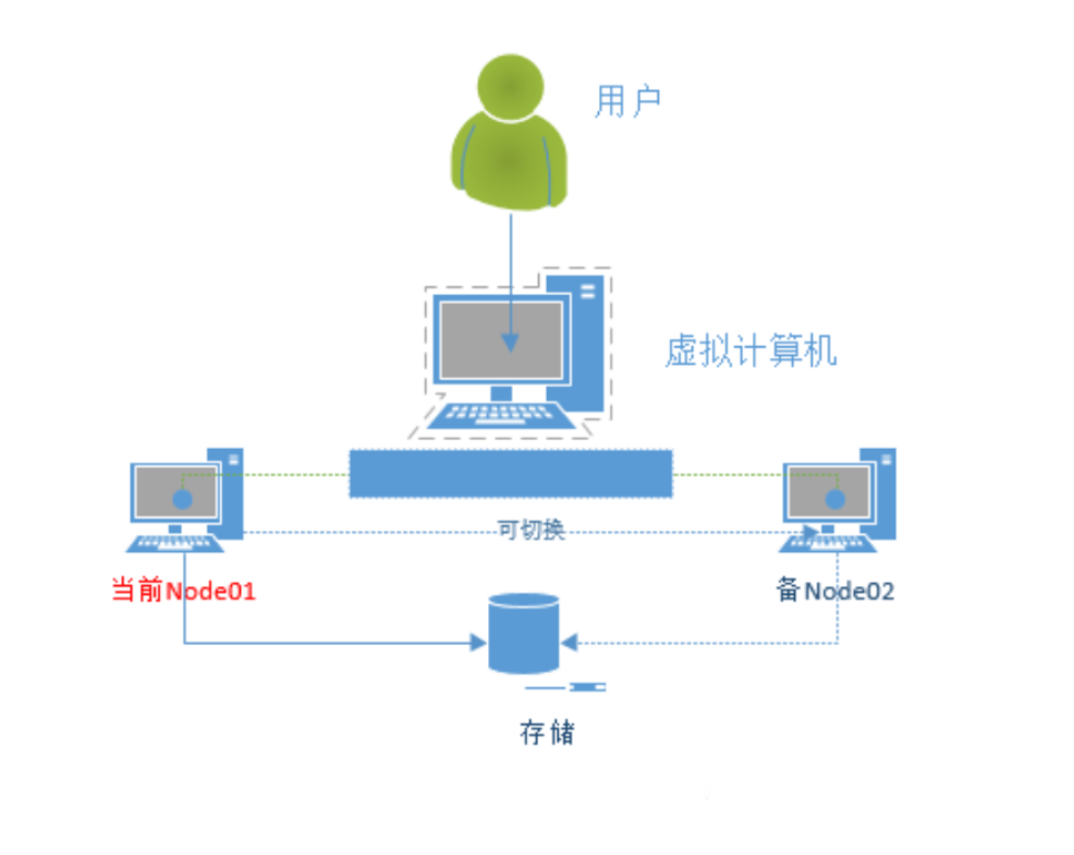 High availability Cluster高可用群集,简称HAC ;主要用于高可用解决方案的实现,节点间以主备形式,实现容灾;在大型故障(宕机,服务器故障)的情况下实现快速恢复,快速提供服务。如下图所示:当前节点在Node01,所有业务在Node01上运行,若发生故障服务和资源会转移到Node02上。高可用集群的另外一个特点是共享资源,多个节点服务器共享一个存储资源,该存储可在不同节点之间转移。