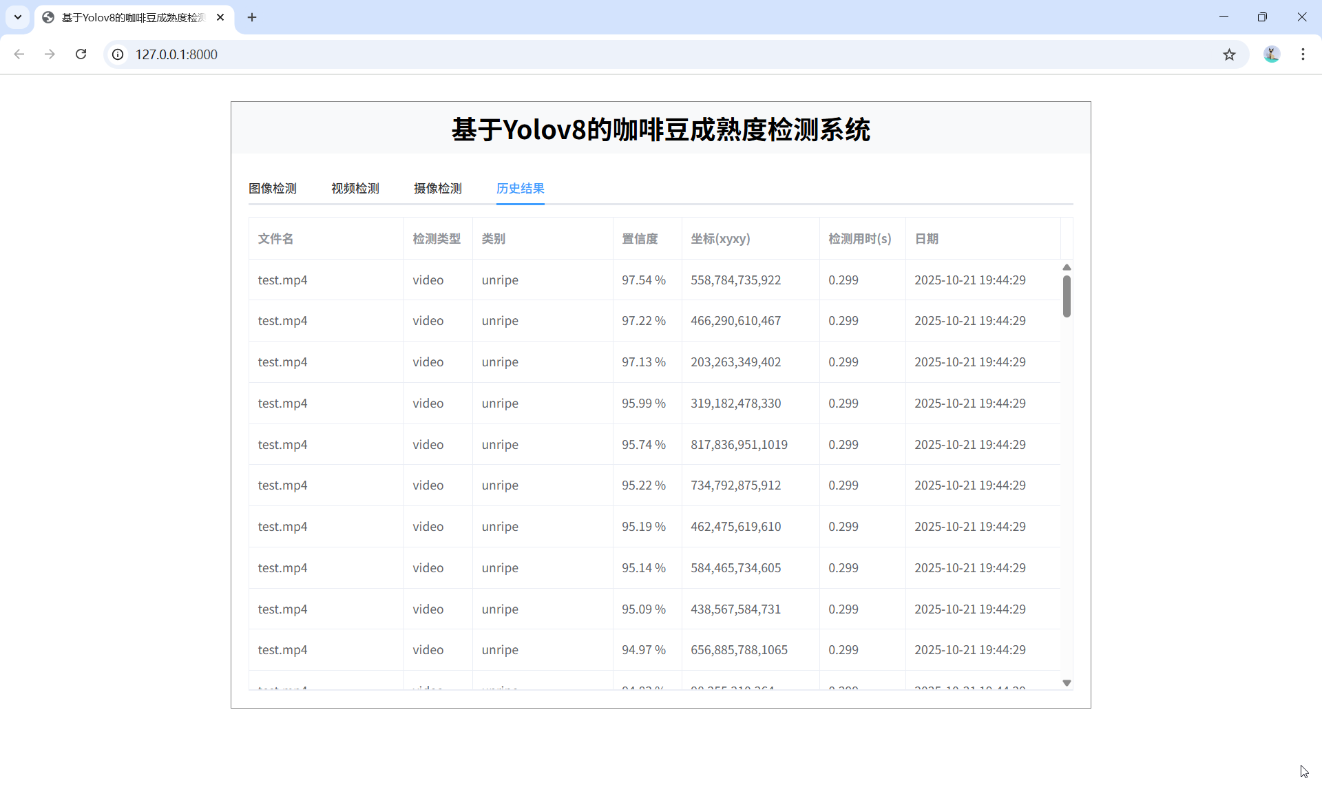 基于yolov8的咖啡豆成熟度检测系统在pytorch框架下实现的,这是一个完整的项目,包括代码,数据集,训练好的模型权重,模型训练记录,Web前端界面和各种模型指标(精确率、召回率等)等。
