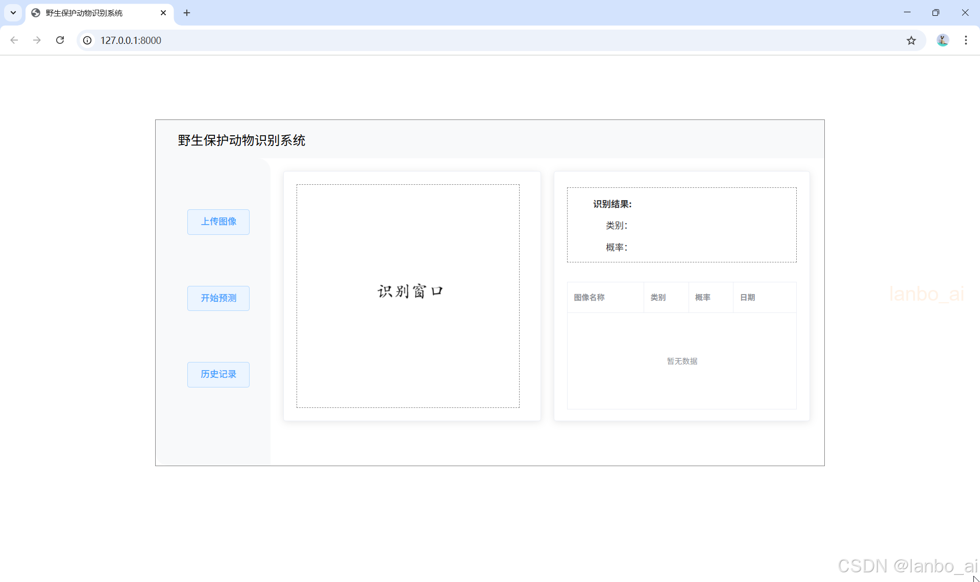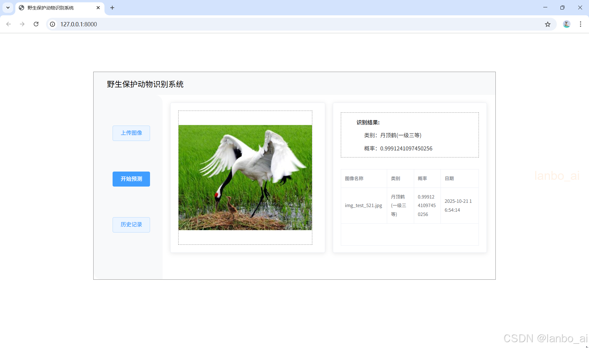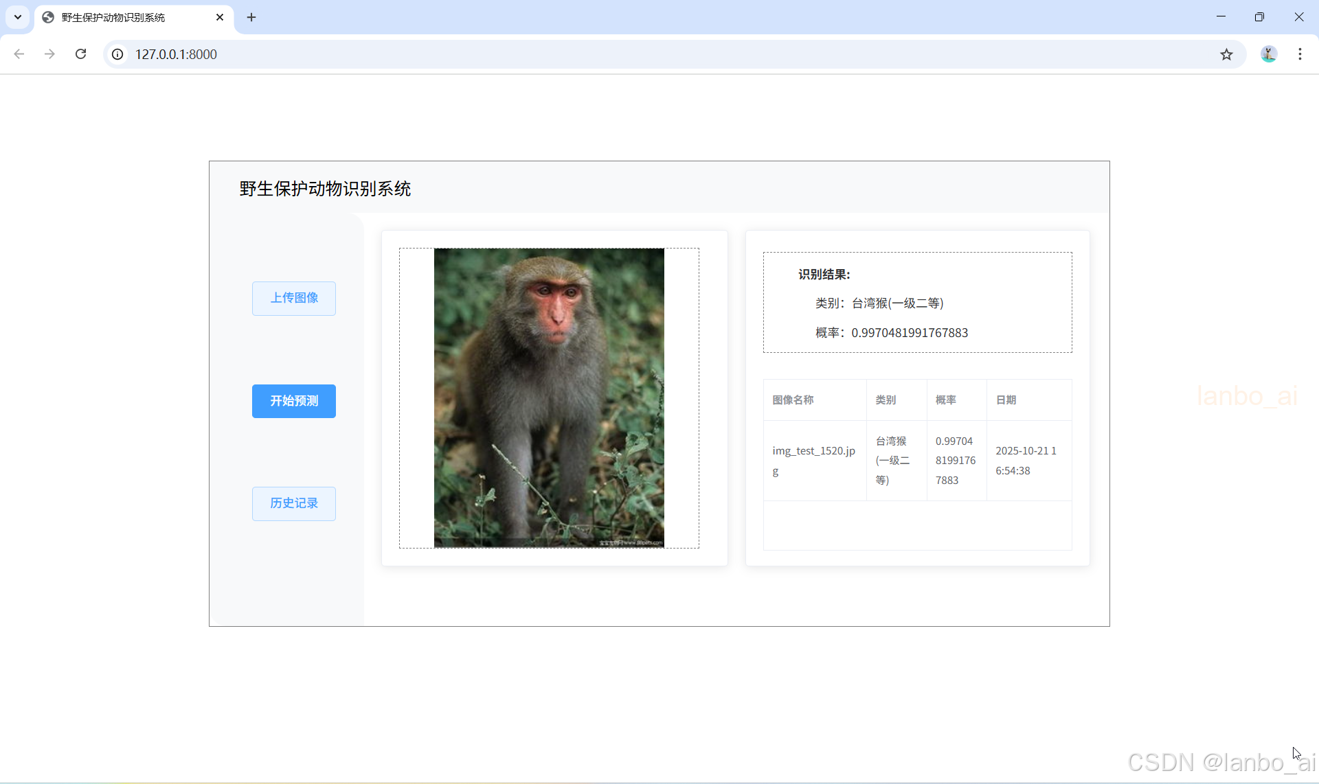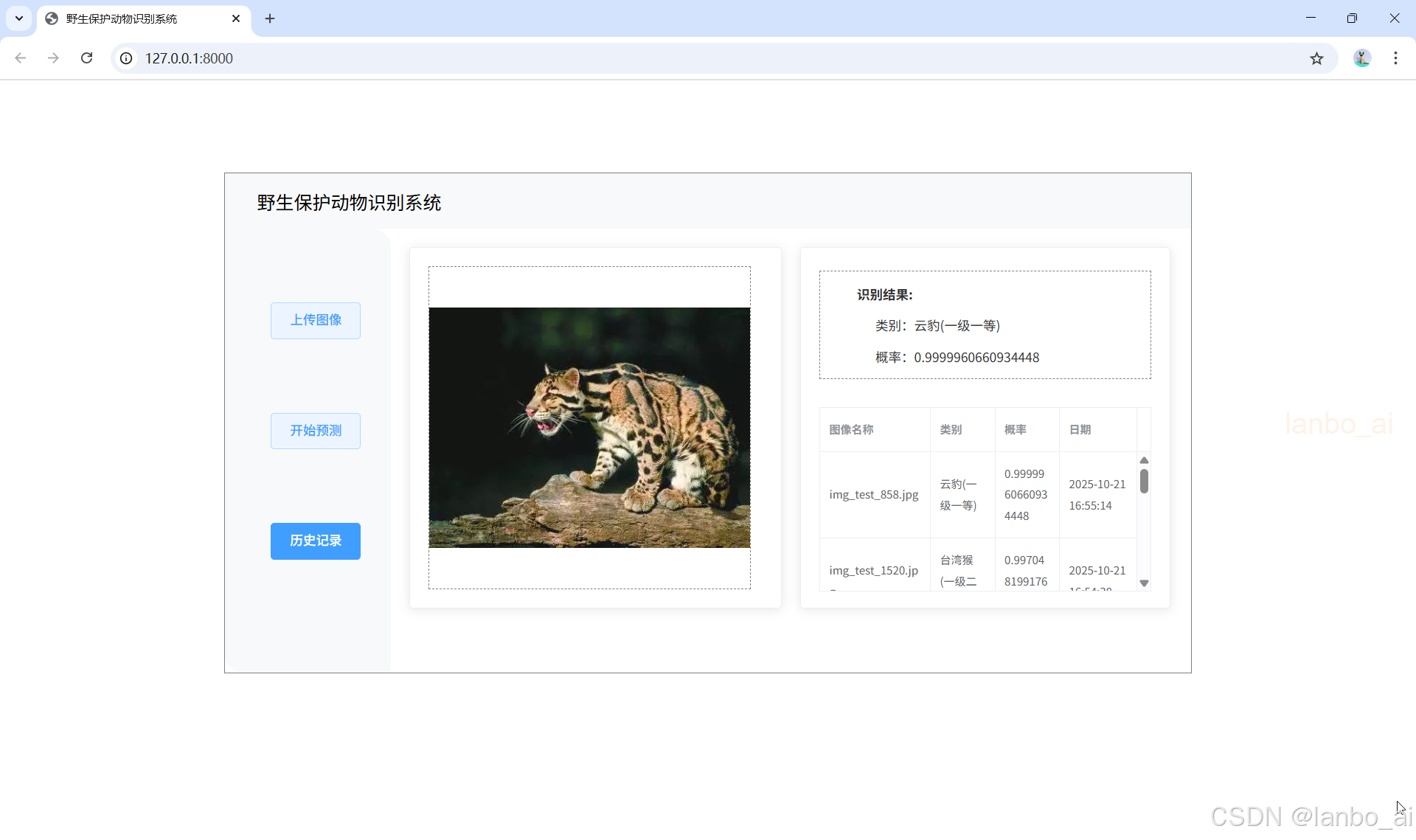 基于卷积神经网络的野生保护动物识别系统是在pytorch框架下实现的,这是一个完整的项目,包括代码,数据集,训练好的模型权重,模型训练记录,Web前端界面和各种模型指标图表等。