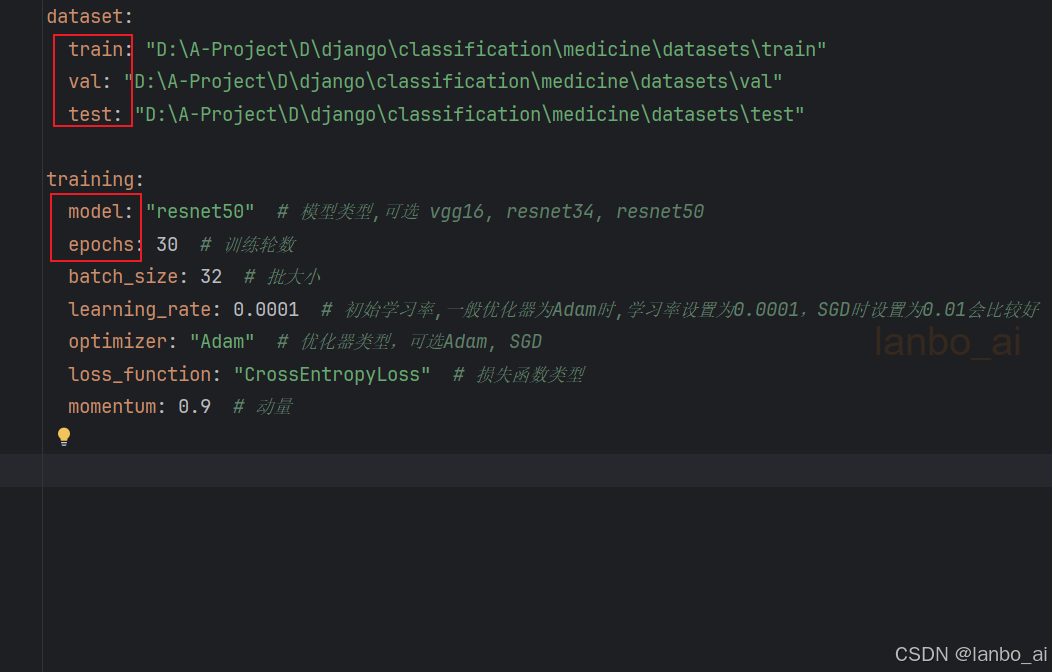 第一步:修改config.yaml的数据集路径(训练集、验证集、测试集),模型名称、模型训练的轮数