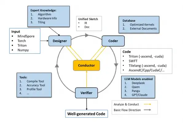 AKG提供了一款 AI 驱动的算子代码生成工具,利用大语言模型(LLM)的代码生成能力,通过LLM规划和控制多Agent 协同,完成多后端、多类型的AI算子生成和优化。