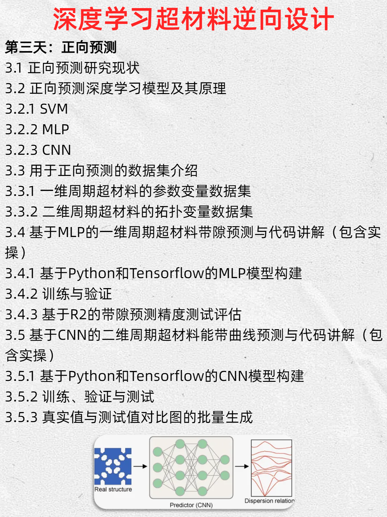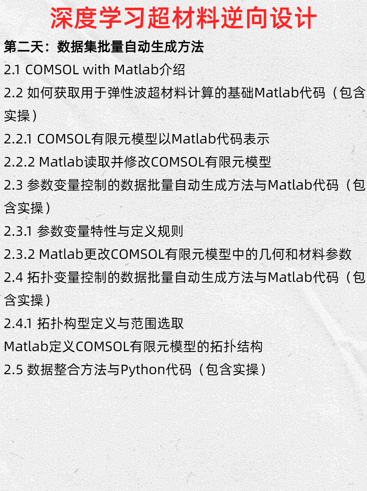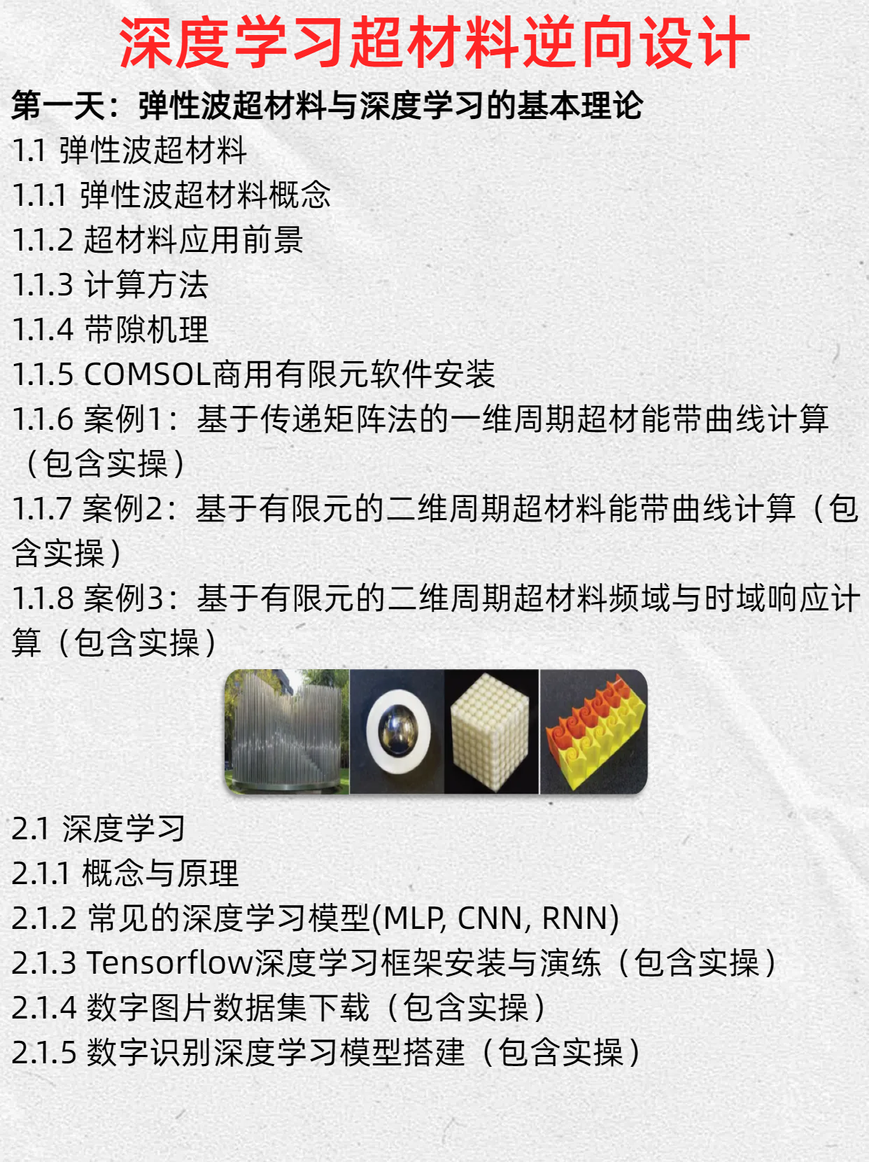 这篇课程介绍将系统讲解弹性波超材料与深度学习的交叉研究,包含6大核心内容:1)弹性波超材料基础理论与计算方法;2)TensorFlow深度学习框架应用;3)领域研究现状分析;4)COMSOL联合Matlab实现数据集自动生成;5)基于PINN网络的色散曲线预测与设计方法;6)深度学习在正向预测、参数优化和拓扑设计中的实现。