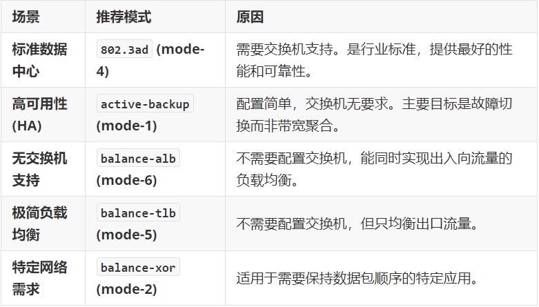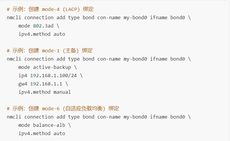 创建 Bond 连接时,使用 mode 参数指定上述任一模式: