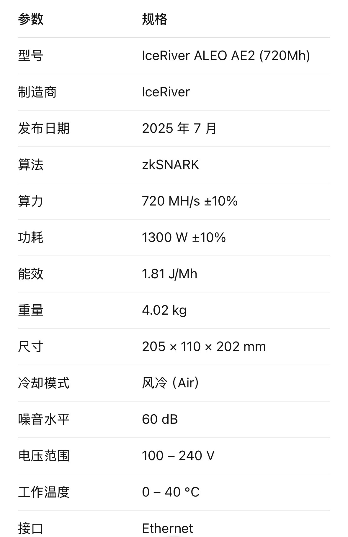 一、IceRiver ALEO AE2 参数概览
