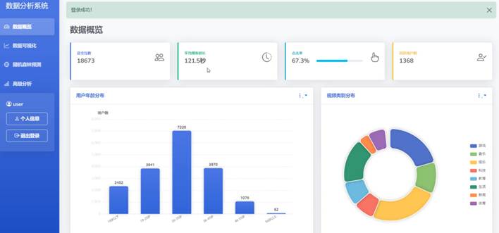 本研究设计的基于随机森林算法的视频用户点击行为预测模型,其数据分析系统具备五大核心功能模块。数据概览模块提供了用户行为数据的整体统计信息,如用户数量、视频点击总量、日均点击率等,使管理员能够快速把握数据集的规模和分布。数据可视化模块则通过多样化的图表展示用户行为数据的细节,例如柱状图展示不同类别视频的点击量对比,折线图展示用户点击量的时间趋势,热力图展示用户活跃时间段等,从而直观地揭示数据背后的规律和模式。随机森林预测模块是系统的核心,它利用训练好的随机森林模型对用户未来的点击行为进行实时预测,并输出预测结果,为视频推荐提供直接的依据。高级分析模块则进一步提供了模型评估指标的展示,以及特征重要性分析功能,帮助用户深入理解模型的工作原理和预测结果的可靠性。最后,个人信息模块允许用户查看和修改自己的个人信息,如用户名、密码、联系方式等,增强了系统的用户友好性和数据安全性。这五大功能模块相互配合,共同构成了一个功能完善、易于使用的视频用户点击行为预测与数据分析平台。