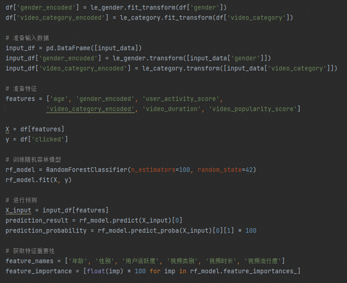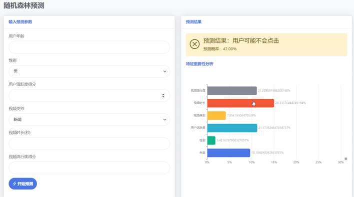 基于随机森林算法的视频用户点击行为预测模型的预测界面设计简洁明了,左侧为输入预测参数区域,用户可以在此填写年龄、性别、用户活跃度得分、视频类别、视频时长以及视频流行度得分等信息。右侧则是预测结果展示区,当用户点击开始预测按钮后,系统会根据输入的参数利用随机森林模型进行预测,并在上方显示预测结果及概率。下方则以条形图的形式展示了各个特征的权重重要性分析,帮助用户理解哪些因素对点击行为的预测影响最大。这种直观的界面设计使得非专业人士也能轻松理解和操作预测过程,提高了模型的实用性和易用性。随机森林预测界面具体实现图如图5-4所示: