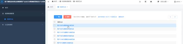 管理员点击视频互动界面可以看到用户与视频的互动,点击即可查看用户ID,视频ID,观看时长,互动时间等信息。视频互动管理模块具体实现图如下图所示:
