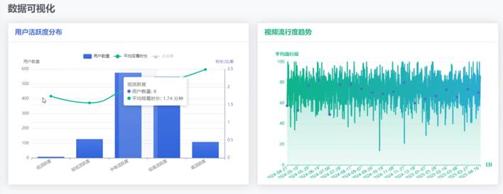 基于随机森林算法的视频用户点击行为预测模型的数据可视化模块左侧的用户活跃度分布图表展示了不同时间段内用户的活跃趋势,通过蓝色柱状图表示用户数量,绿色折线图显示平均在线时长,帮助管理员了解用户的活跃时段和变化趋势。右侧的视频流行度趋势图表则详细描绘了特定视频在不同时间段的受欢迎程度,通过绿色线条波动展示平均在线人数的变化,使管理员能够及时掌握热门视频的流行趋势和受众反馈。这些可视化功能模块不仅提供了清晰的数据洞察,还辅助管理员制定更加精准的市场推广和内容优化策略,提升了用户体验和平台竞争力。数据可视化界面具体实现效果图如图5-3所示: