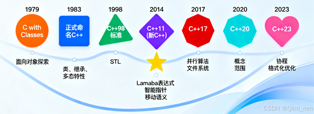 2014-2020 年:C++14(完善 C++11)、C++17(增强 STL 和并行编程)、C++20(引入概念、模块等)陆续发布,逐步解决语言冗余性问题,提升开发效率。