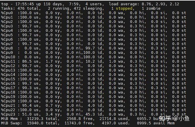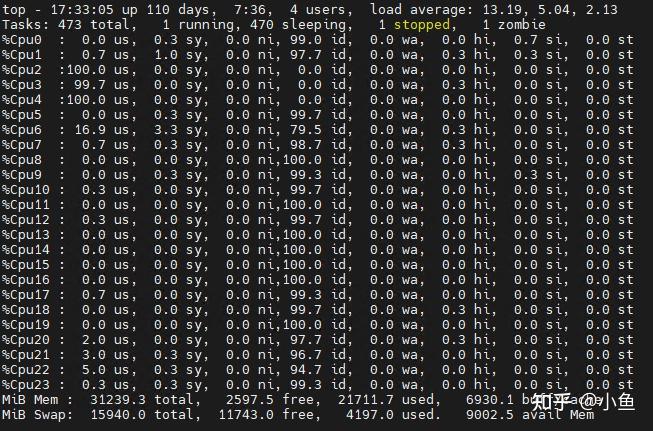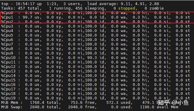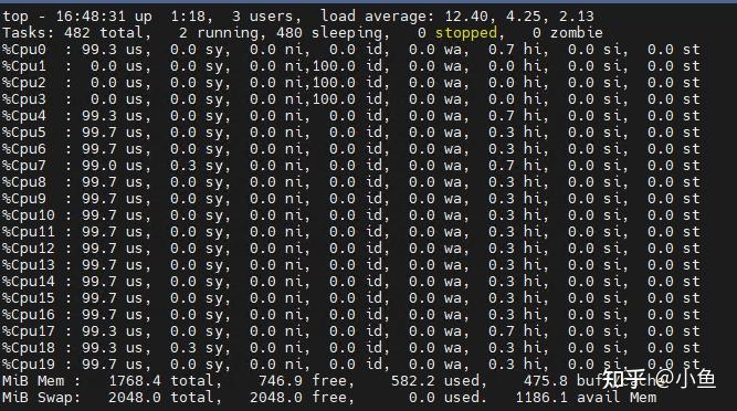 我们编写一个测试用例,该测试用例将生成一个进程,在进程中创建20个线程,每个线程完全占用CPU时间。在没有指定CPU核心的情况下,进程在被隔离的CPU核心外的核心上运行(图1所示),使用taskset后,进程在被隔离的CPU核心上运行(图2所示)。