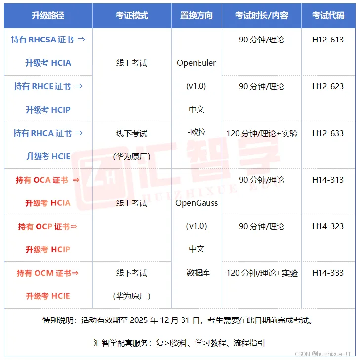 ✅ 升级考试难度更低:华为HCIP及HCIE(openEuler、openGauss)传统考试需要经过笔试及实操,且实操占分数较高,两者均通过才可申请证书,通过率较低!持有Oracle或Redhat证书者参与升级考试仅需考笔试(HCIE例外),升级考试模式下笔试通过即可申请证书,通过率较高。