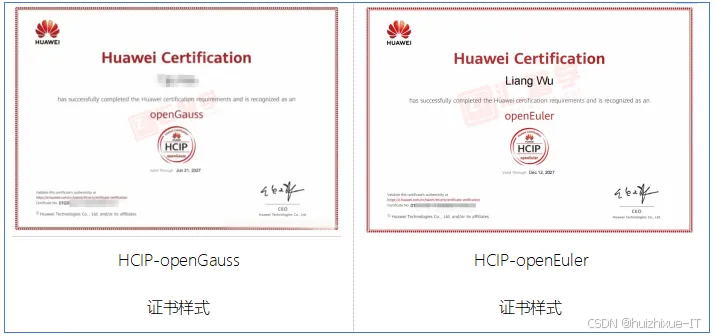 ✅ 证书一致:无论您是选择升级考试还是传统VUE模式下考取openEuler、openGauss证书,在不同的考试模式下,证书样式一致,均为华为颁发。