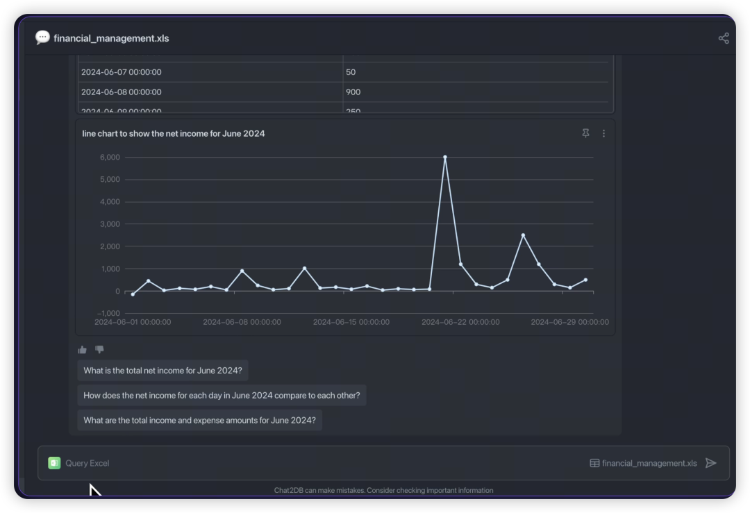 在分析Excel数据时,如果不熟悉统计函数会非常麻烦。但使用Chat2DB,只需选择本地Excel文件,它能帮你完成数据统计,甚至生成美观的图表,便于与产品经理或运营分享。