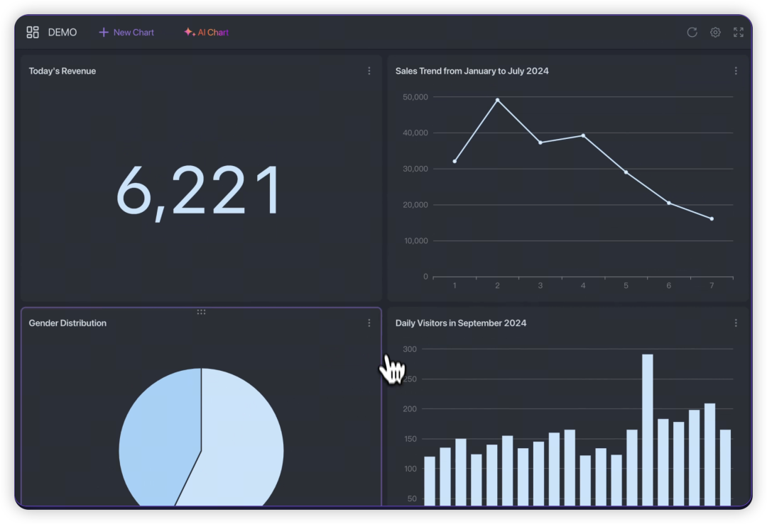 以往,老板或产品、运营常常要求你导出报表,现在你可以让他们自己来做了。只需简单描述,Chat2DB便能生成可视化报表,若结果不尽如人意,那就看看他们的询问是否清晰。