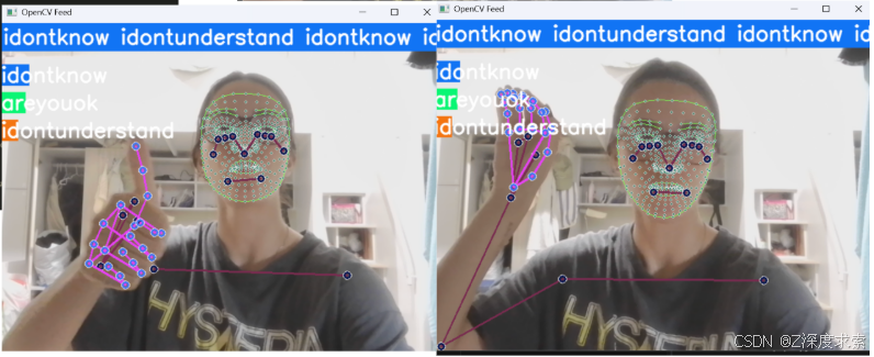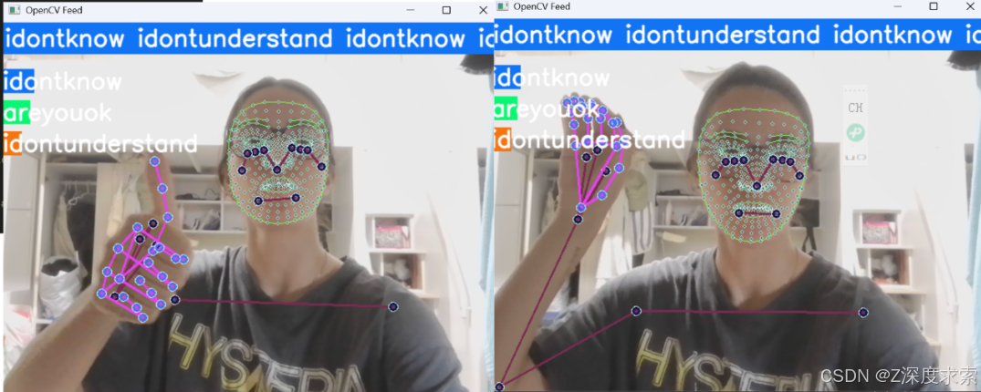 手语识别模型输出针对每一帧对应的动作序列,输出手语语义分类结果(如 “areyouok”“idontknow” 等预设句子类别),通常以概率分布形式呈现(如