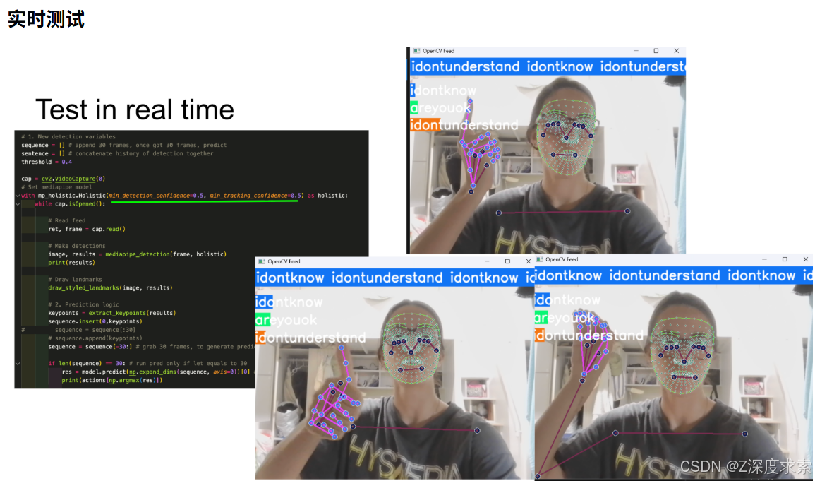 系统支持实时测试功能,可对预设的手语句子进行识别与情感分析,实时测试效果参考 real_time.jpg。
