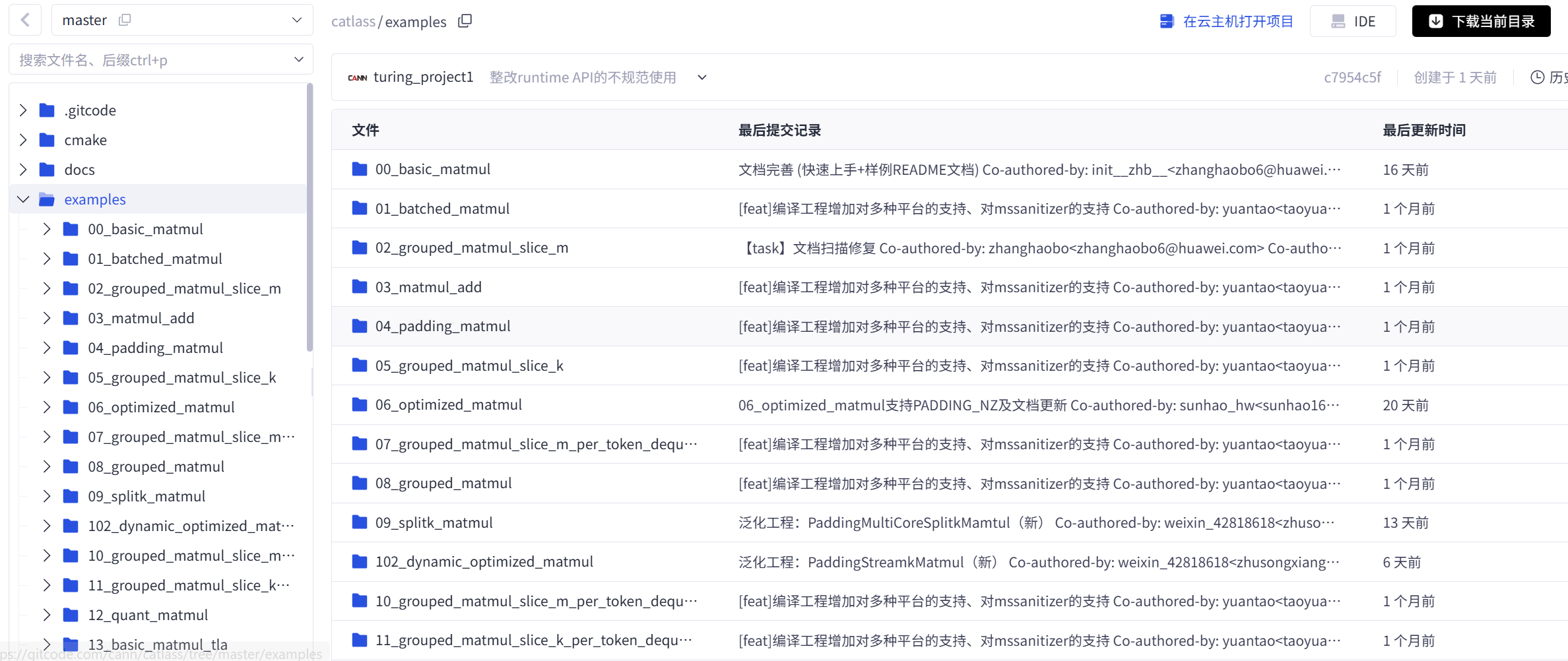 在 gitcode 的代码仓库里,我们也可以看到 CMake 文件夹,里面包含了 Catlass 构建所需的顶层 CMakeLists.txt 以及各模块的子 CMake 文件。后续我们只需要通过 CMake 来管理工程和编译流程。