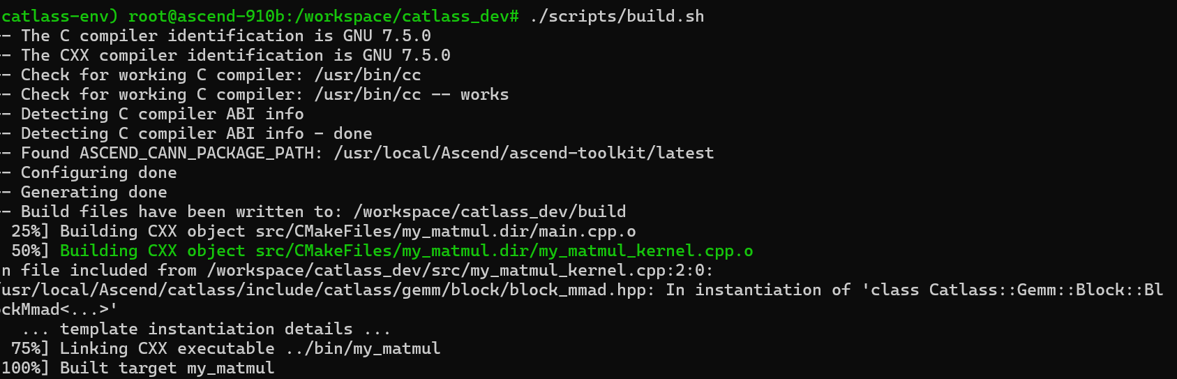 运行我们准备好的 build.sh 脚本。CMake 会自动检测你的编译器版本和 Catlass 安装路径。