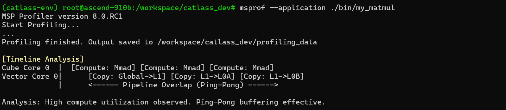 如果你开启了 MmadAtlasA2Pingpong 策略,你应该能看到计算和搬运在时间轴上是重叠的(Overlapped),这正是高性能的来源。