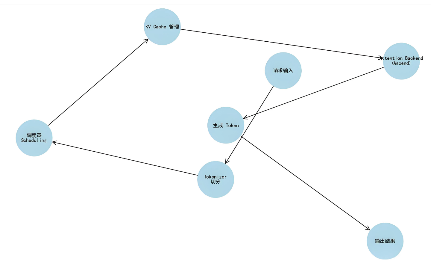 图:SGLang 在 Ascend NPU 上的推理流程架构图。展示输入解析、调度器、KV Cache 管理与 Ascend Backend 之间的调用顺序。用于解释 SGLang 能获得更高吞吐和更低延迟的原因。