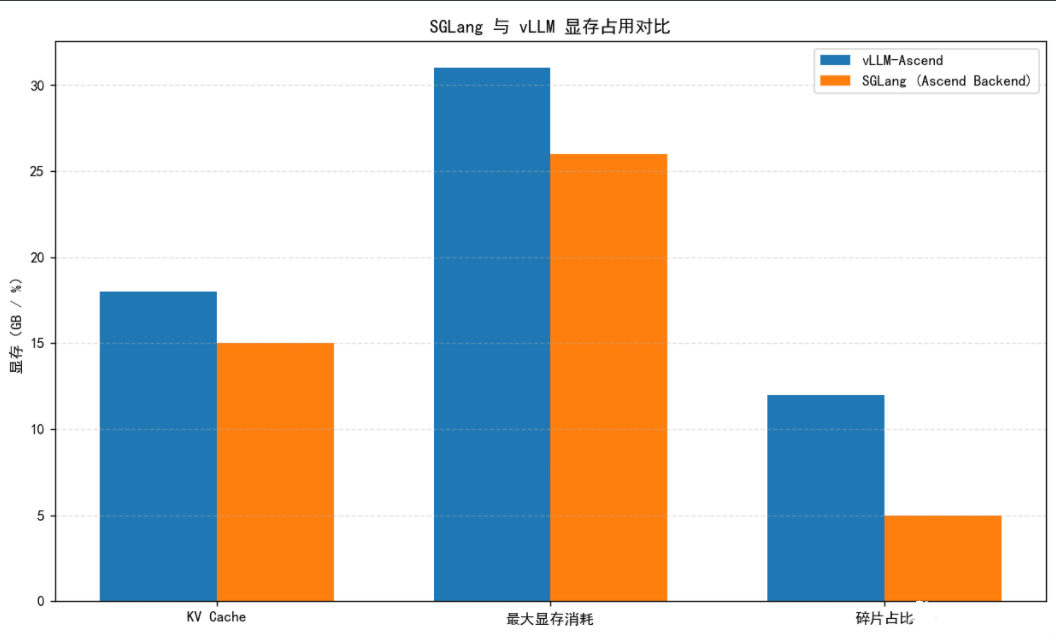 图:SGLang 与 vLLM-Ascend 的显存占用与碎片率对比。SGLang 的显存复用策略更优,在大批量推理和长时间服务中具有更稳定表现。