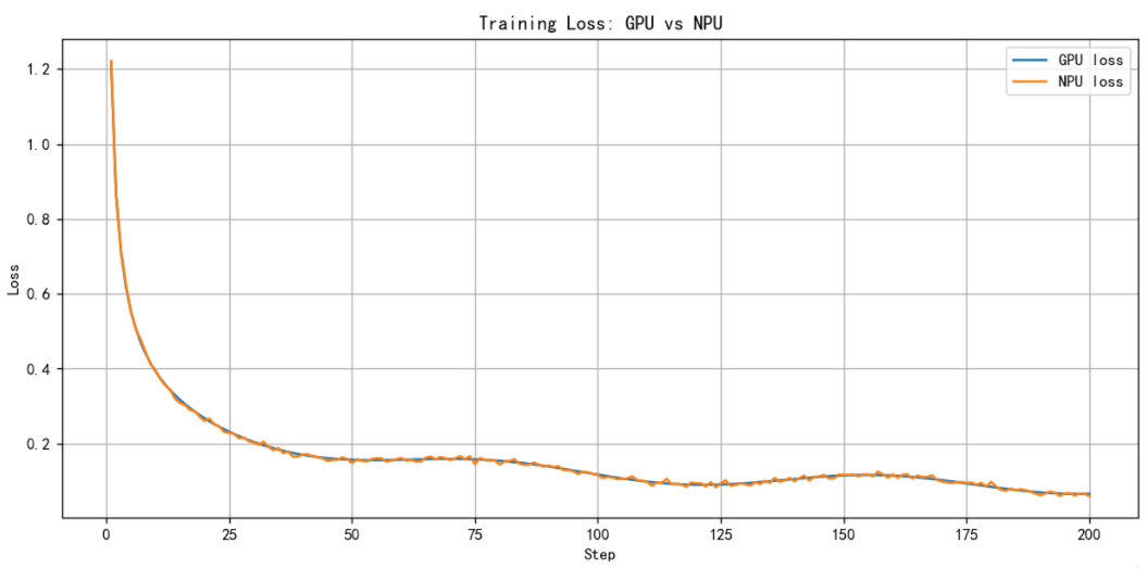 GPU 与 NPU 训练 Loss 曲线对比。尽管 Loss 数值不是强化学习中的主指标,但整体收敛趋势保持一致,表明两端训练稳定性相当。