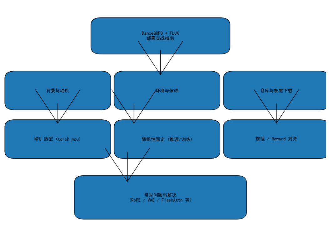 我们围绕 Flux + DanceGRPO 在昇腾 NPU 上的部署,从环境搭建、模型修改、随机性固定、推理与 reward 对齐,到最终端到端验证。