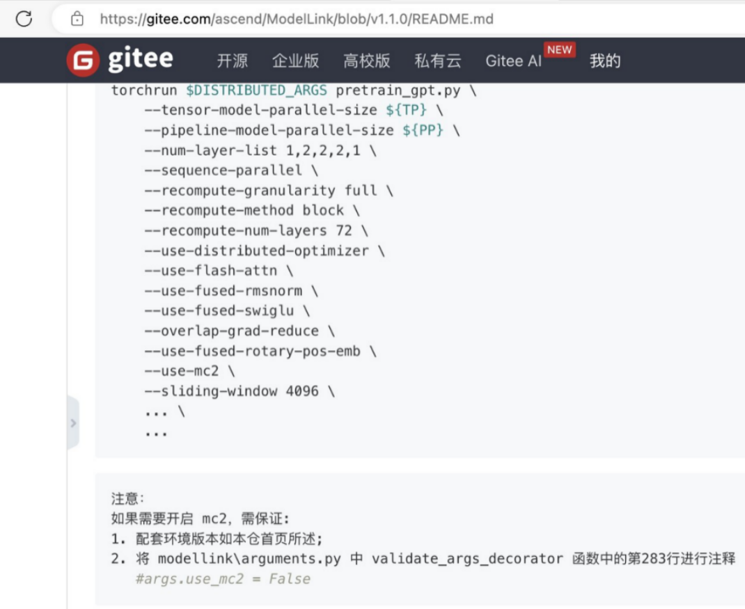 - **开启后:**计算与通信在 NPU 内部实现指令级流水掩盖,通信时间几乎消失。 **操作指令:**在 ModelLink 的启动脚本中,除了