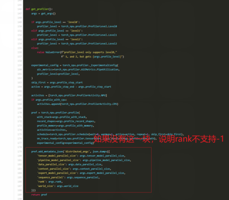 根因分析: 翻看 torch_npu 的源码发现(见上图),新版 Profiler 接口移除了对 -1(全部 Rank)参数的隐式支持。现在必须显式指定具体的 Rank ID 列表。