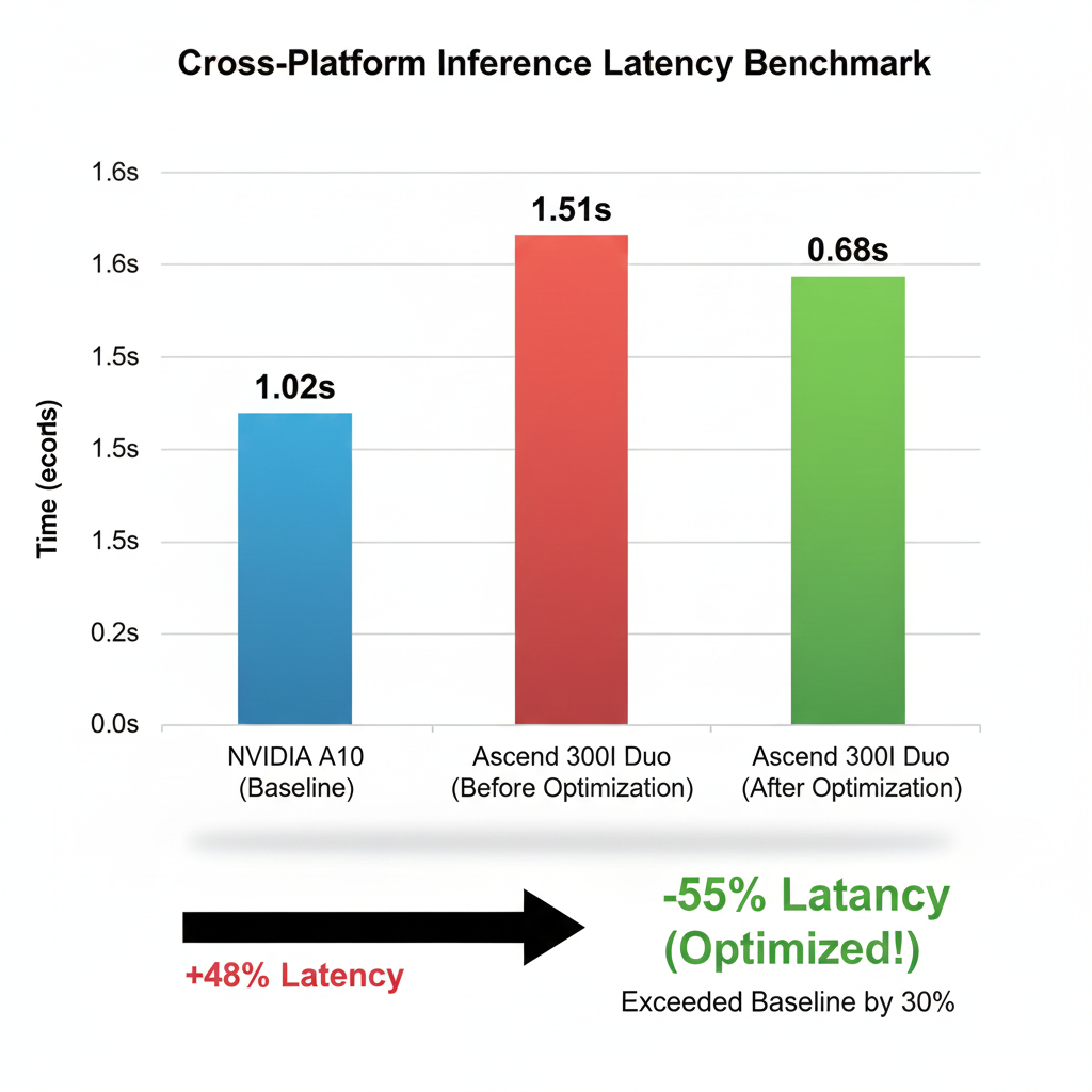 如图所示,最初迁移至昇腾时(红色柱状),耗时为 1.51s;在定位并解决计算延迟问题,并应用了 MindIE/Torchair 推理后端优化后,耗时骤降至 0.68s(绿色柱状)。相比于最初的 NVIDIA A10 环境(1.02s),我们不仅填平了迁移带来的“性能坑”,还额外获得了约 30% 的性能提升。这充分证明了在适配异构芯片时,充分利用硬件专属工具链(CANN)进行深度优化的必要性。