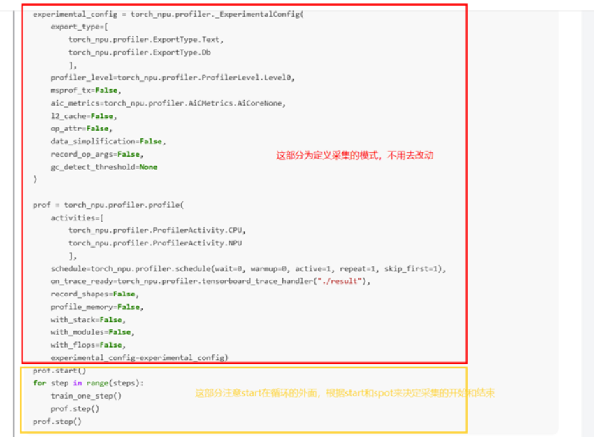 具体操作:在训练或推理代码(如run.py或train.py)中添加torch_npu.profiler.profile接口。