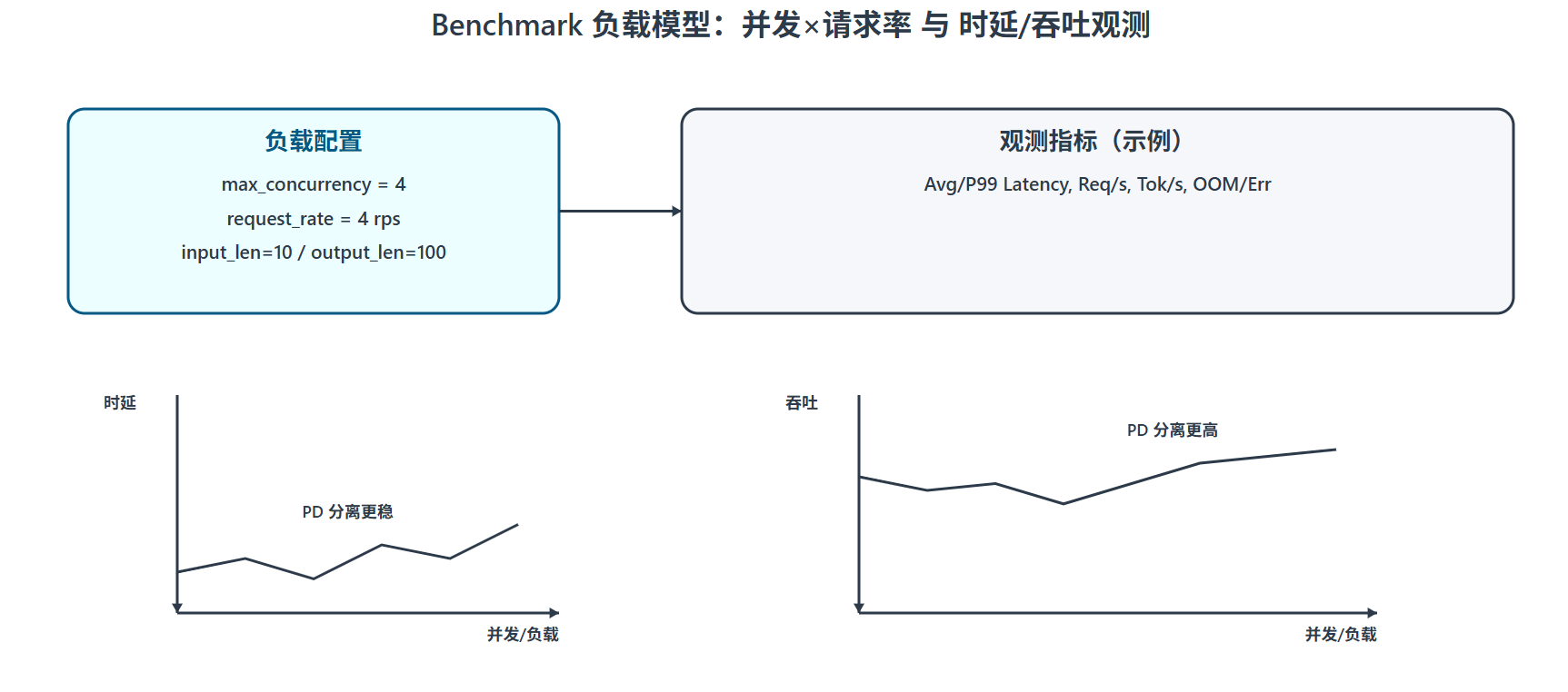 | 关注指标:平均时延、P99、吞吐(req/s 或 tok/s)。对比 PD 混部 vs PD 分离,一般在中高并发下分离更稳。 |