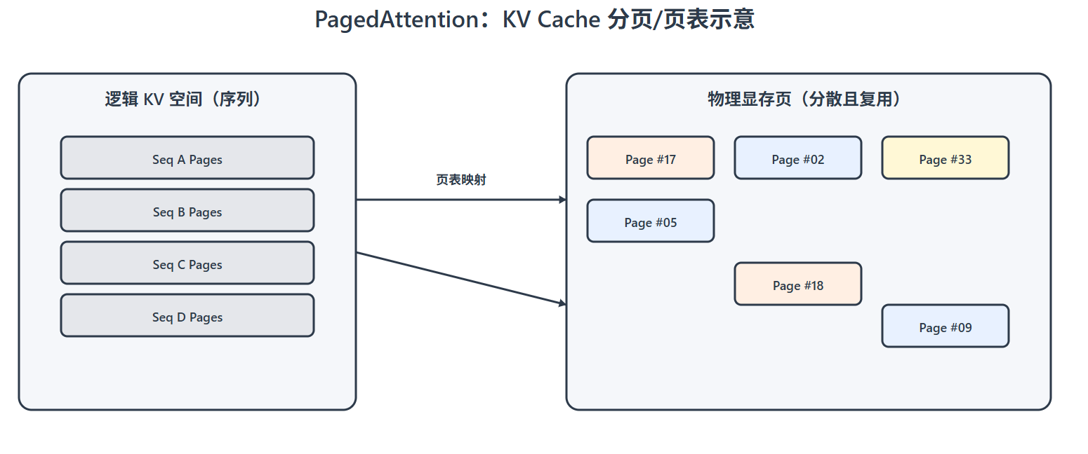 配合 vLLM 的 PagedAttention(分块管理 KV 内存),可以有效降低 Cache 碎片化与浪费,让 高并发 + 长上下文 的场景更稳、更省、更快。