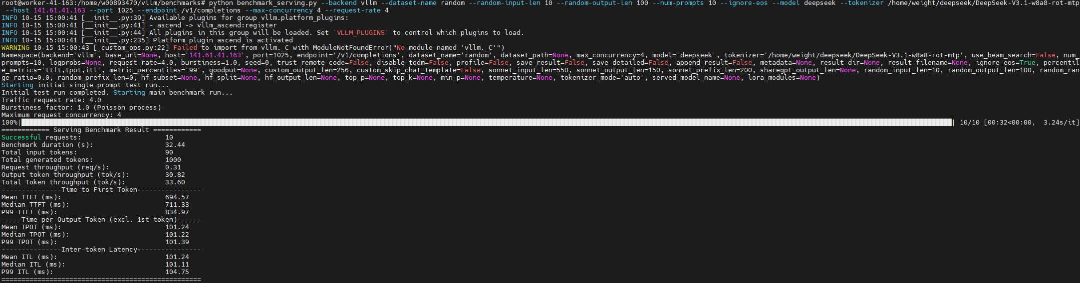 | Bashsource /home//cmc/cann_8.2.rc1/ascend-toolkit/set_env.sh source /home//cmc/cann_8.2.rc1/nnal/atb/set_env.sh cd /home//vllm/benchmarks/ python benchmark_serving.py \ --backend vllm \ --dataset-name random \ --random-input-len 10 \ --random-output-len 100 \ --num-prompts 10 \ --ignore-eos \ --model deepseek \ --tokenizer /home/weight/deepseek/DeepSeek-V3.1-w8a8-rot-mtp \ --host 141.61.41.163 \ --port 1025 \ --endpoint /v1/completions \ --max-concurrency 4 \ --request-rate 4 |