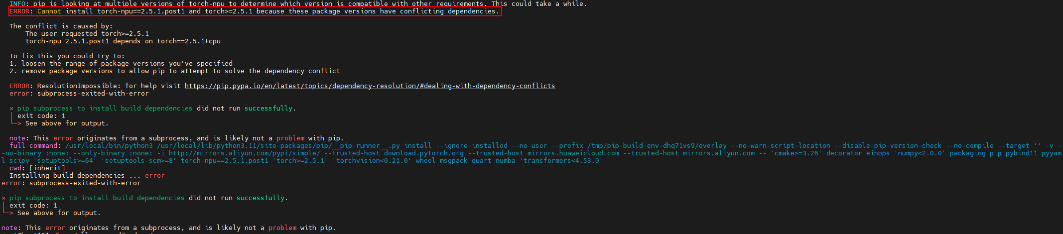 现象:Cannot install torch-npu==2.5.1.post1 and torch>=2.5.1 …