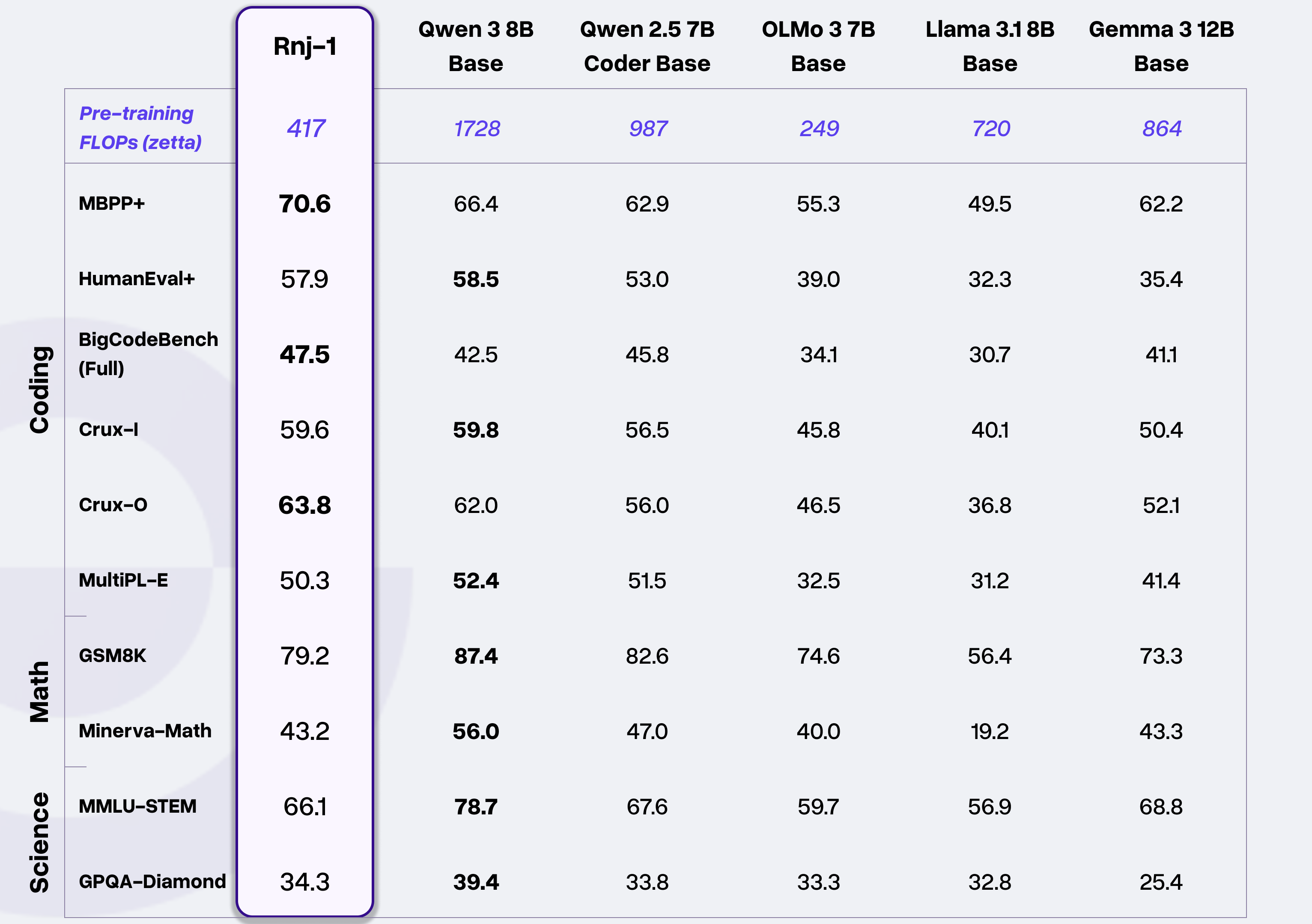 Rnj-1 这一系列由 Essential AI 从零训练的 8B 参数开权重密集模型,针对代码和 STEM 优化,具备与 SOTA 开权重模型相当的能力。这些模型在多种编程语言中表现良好,具备强大的代理能力(例如,在mini-SWE代理内的代理框架内),同时在工具调用方面也表现出色。