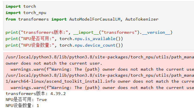 若输出NPU可用且设备数量为1,说明依赖安装和昇腾NPU适配正常,可进入下一步模型部署流程,前面的警告不用管,无伤大雅,大体意思是Ascend NPU 工具包(华为昇腾AI处理器的开发工具)是由其他用户(我这里是使用的root,你们安装时如果使用的管理员账户也会出现)安装的,警告当前运行程序的用户账户与工具包文件的所有者不匹配。