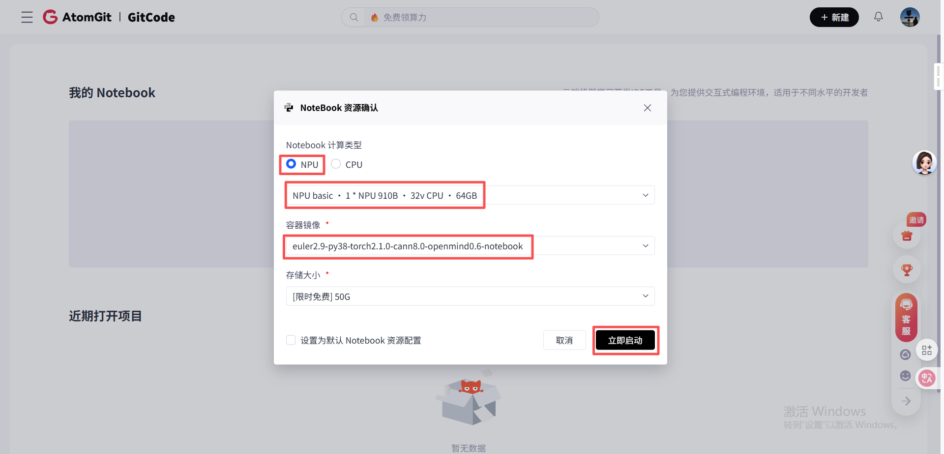 - 选择计算类型为NPU、硬件规格为NPU basic(1*NPU 910B、32vCPU、64GB)、容器镜像为euler2.9-py38-torch2.1.0-cann8.0-openmind0.6-notebook(预装PyTorch和昇腾适配库),点击“立即启动”;