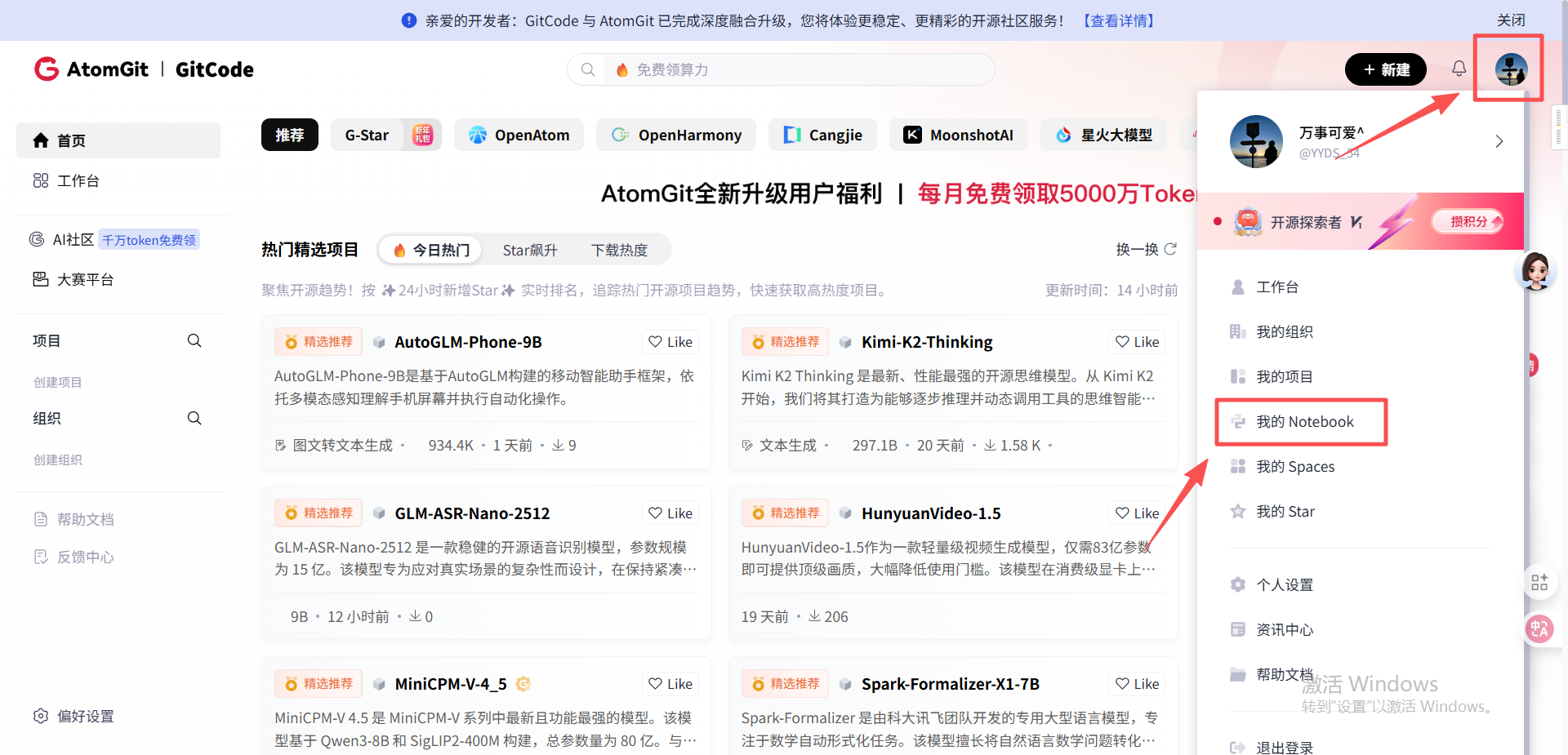 - 登录GitCode账号,进入“我的Notebook”页面