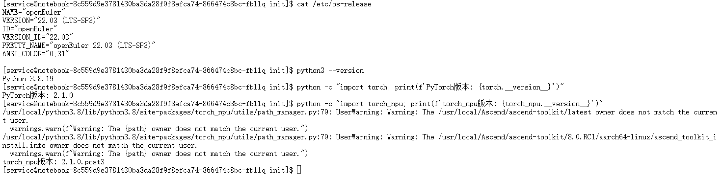 正常情况下,系统应为欧拉系统(EulerOS),Python版本≥3.8,PyTorch版本为2.1.0,torch_npu版本为2.1.0.post3(与PyTorch严格匹配)。若出现版本不匹配(如torch_npu版本过低),可通过GitCode Notebook的镜像重新选择或手动升级(具体方法见第五章问题解决)。