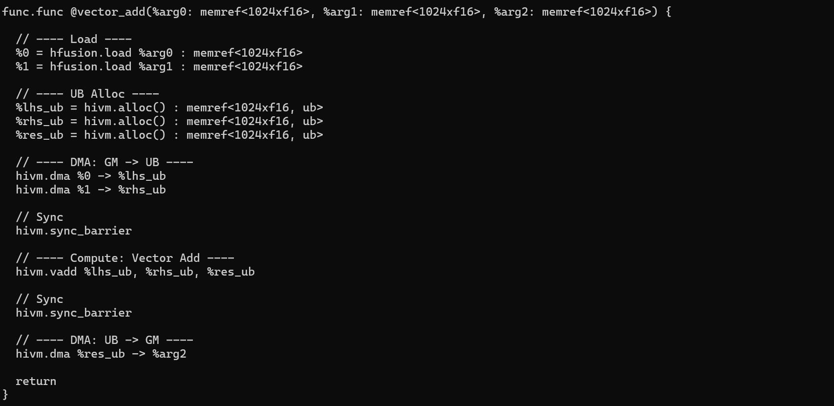Plain Text// input.mlirfunc.func @vector_add(%arg0: memref<1024xf16>, %arg1: memref<1024xf16>, %arg2: memref<1024xf16>) { // 读取 Global Memory (GM) %0 = hfusion.load %arg0 : memref<1024xf16> %1 = hfusion.load %arg1 : memref<1024xf16> // 抽象加法,未指定执行单元 %2 = hfusion.add %0, %1 : tensor<1024xf16> // 写回 Global Memory hfusion.store %2, %arg2 : memref<1024xf16> return} |